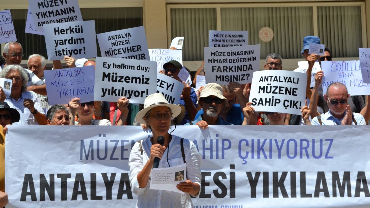 Müze Çalışma Grubu’nun çağrısıyla Antalya Arkeoloji Müzesi önünde yapılan basın açıklamasında, Kültür ve Turizm Bakanlığı’nın yıkım kararının derhal geri çekilmesi ve müzenin restore edilerek korunması talep edildi.