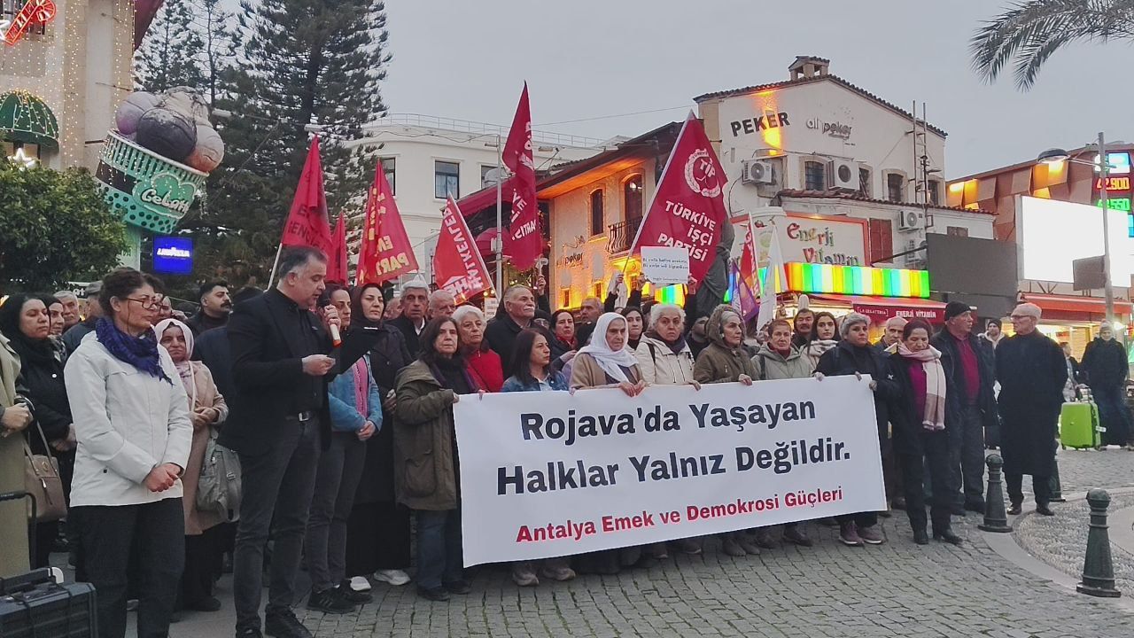 Antalya Emek ve Demokrasi Güçleri, Suriye’de yaşanan son gelişmelere ilişkin Attalos Anıtı önünde basın açıklaması gerçekleştirdi. Açıklamada, Ortadoğu’nun emperyal planlar doğrultusunda yeniden savaş ve çatışma sarmalına sürüklendiği vurgulandı.