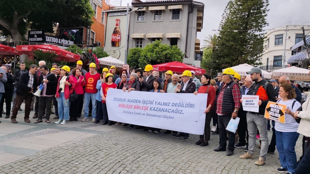Antalya Emek ve Demokrasi Güçleri, Yıldızlar SSS (Üçes) Holding ve TMSF’nin hak gaspına uğrayan Doruk Madencilik işçilerinin 14 gündür süren direnişine dikkat çekmek ve dayanışma amacıyla Attalos Anıtı önünde basın açıklaması düzenledi. Açıklamada, işçilere yapılan muamelenin “köle muamelesi” olduğu vurgulanırken, holding ve hükümet yetkilileri göreve çağrıldı.