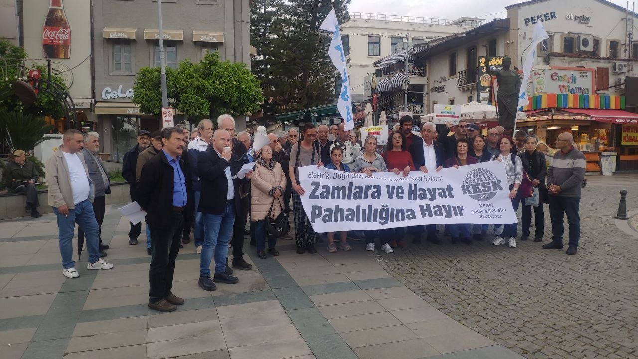 Antalya’da KESK Antalya Şubeler Platformu, elektrik ve doğalgaz zamlarına karşı Attalos Anıtı önünde basın açıklaması gerçekleştirdi. Platform adına açıklamayı ESM Antalya Şube Başkanı Tanju İşeri okudu. Açıklamada, enerji zamlarının geri çekilmesi ve temel tüketim kalemlerindeki vergi yükünün kaldırılması talep edildi.