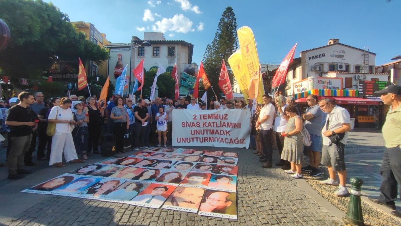Antalya Emek ve Demokrasi Güçleri, 2 Temmuz 1993’te Sivas Madımak Oteli’nde yakılarak katledilen 33 aydın, sanatçı ve devrimciyi anmak için Attalos Anıtı önünde bir araya geldi. Saygı duruşuyla başlayan anmada, basın açıklamasını KESK Antalya Şubeler Platformu Dönem Sözcüsü Devrim Mol okudu.