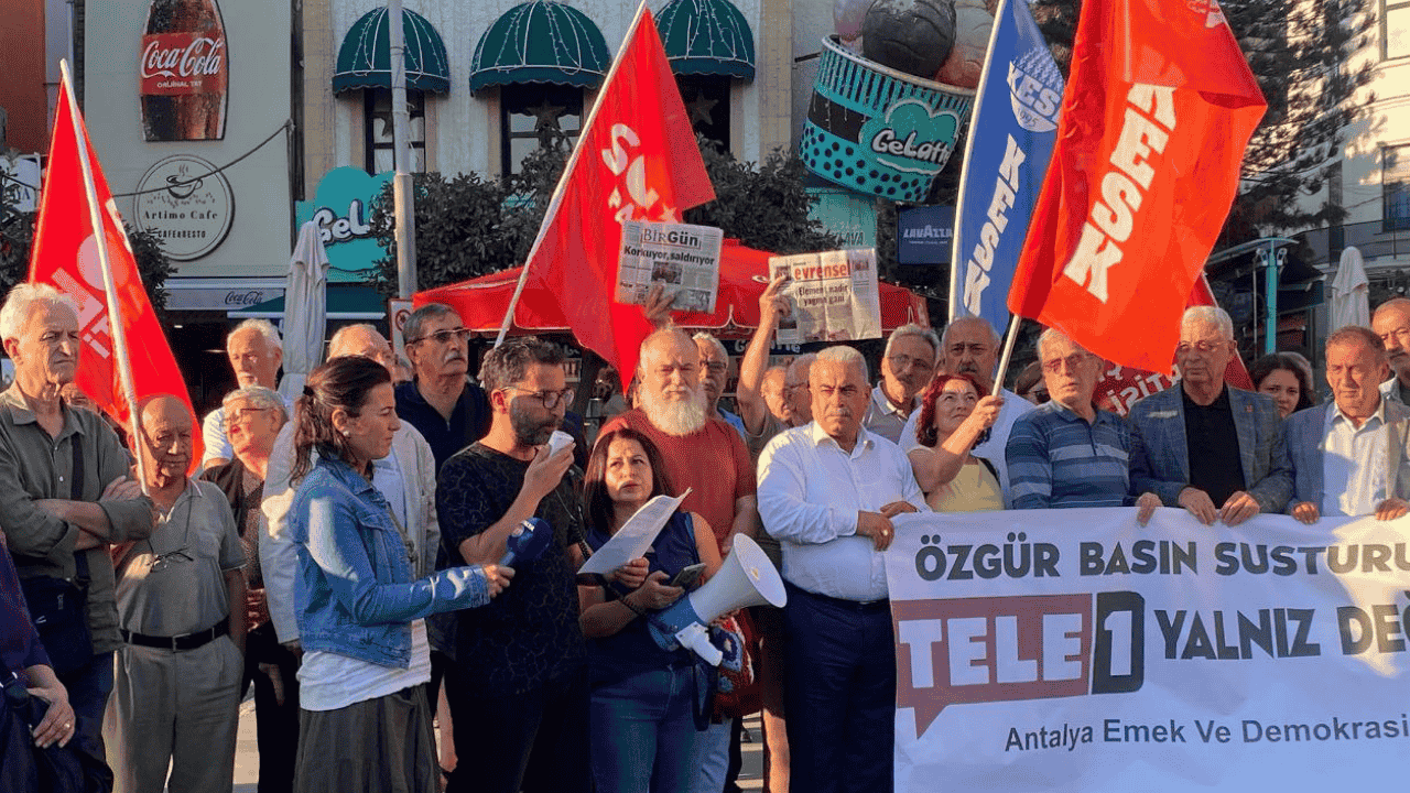 Antalya Emek ve Demokrasi Güçleri, Tele1’e kayyum atanmasını ve Genel Yayın Yönetmeni Merdan Yanardağ’ın gözaltına alınmasını protesto etti. Attalos Anıtı önünde gerçekleştirilen eylemde basın açıklamasını Çağdaş Gazeteciler Derneği (ÇGD) üyesi gazeteci Bülent Öner okudu.