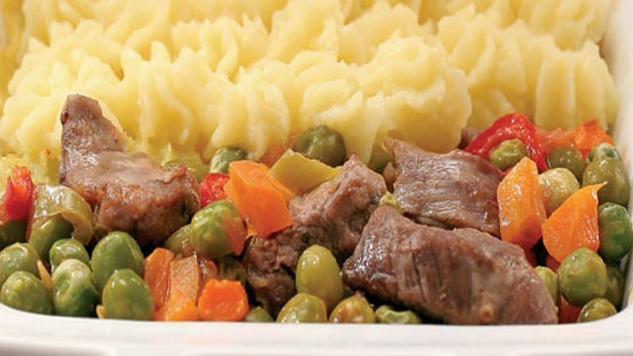 - Hazırladığınız pürenin üçte birini bir fırın tepsisine yayın. Üzerine hazırladığınız et yemeğinizi ilave edin. Bezelyenin üzerine kalan püreyi koyun.