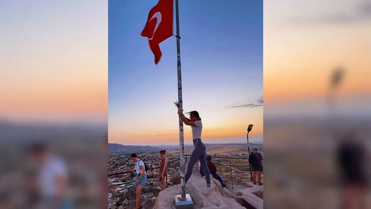 Nevşehir’in Uçhisar beldesinde yabancı uyruklu bir kişinin Türk bayrağı direğinde dans ettiği görüntüler sosyal medyada gündem oldu.