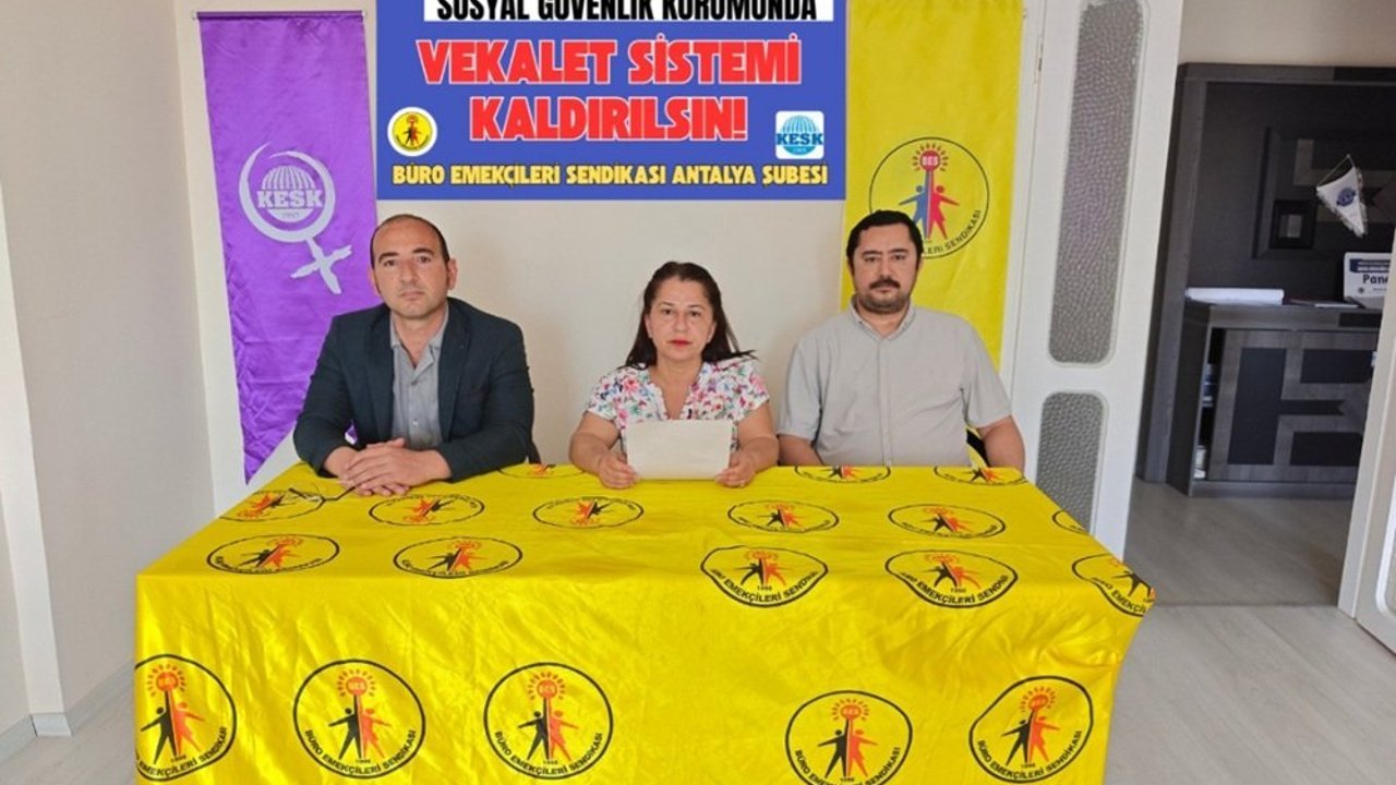 Büro Emekçileri Sendikası (BES) Antalya Şube Başkanı Devrim Mol, SGK’da uygulanan zorunlu rotasyon ve vekalet sistemine ilişkin şube binasında düzenlediği basın toplantısında konuştu. Mol, mevcut uygulamaların çalışma barışını bozduğunu ve personel arasında ciddi mağduriyetler yarattığını belirterek, “Liyakat yerine vekaletin esas alındığı bir sistemle karşı karşıyayız” dedi.
