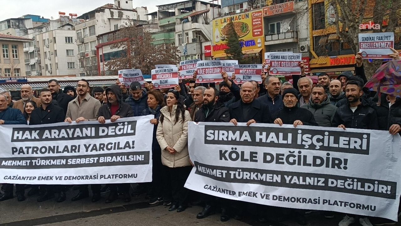 Birleşik Tekstil Dokuma ve Deri İşçileri Sendikası (BİRTEK-SEN) Genel Başkanı Mehmet Türkmen’in, Sırma Halı işçilerinin eylemi sırasında yaptığı konuşma gerekçe gösterilerek tutuklanması üzerine Gaziantep’te bir protesto gösterisi düzenlendi. Balıklı Parkı’nda bir araya gelen Gaziantep Emek ve Demokrasi Platformu üyeleri, sendika yöneticileri ve siyasi parti temsilcileri, Türkmen’e yönelik hukuki sürece tepki gösterdi.