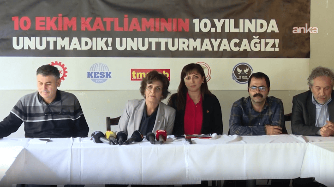 "10 yıl geçti 10 Ekim'in üzerinden, cümle kurmak bizim için hala çok zor. 10 yıl önceki Türkiye ve bugünkü Türkiye arasında bir fark var mıdır hatırlayalım. Ekonomik kriz, yönetme krizi vardı. Çözüm süreci işletiliyordu. Aynen bugün olduğu gibi. Biz dört örgüt savaşa hayır demek için barış ve demokrasi mücadelesini yükseltelim diye Türkiye'nin her tarafından üyelerimizi, demokrasi güçlerini, emek güçlerini Ankara'ya davet ettik. Günlerce tartıştık aslında nasıl bir miting yapmalıyız diye. Biz aslında onbinlerce hatta yüzbinlerce üyemizin ve emekçilerin talebiyle böyle bir miting kararı almıştık o gün. Bu masanın arkasındaki herkes o katliamdan tesadüfen kurtulmuşlar olarak oturuyoruz. Örgütlerimizle birlikte Ankara'daydık. Devletin güvenlik önlemleri alması gereken aldığına inandığımız bir mitingdi. Ve henüz alana inmiştik ki ve arkadaşlarımız gelmeye devam ediyordu ki içimizde iki canlı bomba patladı. O canlı bombalar buraya kadar nasıl geldi? Kim yol vermişti? Nasıl olmuştu? Bu soruları sormayı hiç bırakmadık. "