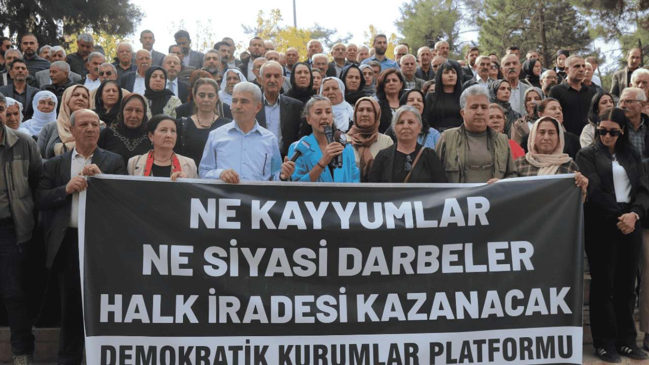 Mardin Büyükşehir Belediye Başkanı Ahmet Türk’ün görevden alınarak yerine kayyum atanmasının yıl dönümü dolayısıyla DEM Parti tarafından Mardin Karayolları Parkı’nda basın açıklaması düzenlendi. Demokratik Kurumlar Platformu da açıklamaya destek verdi.