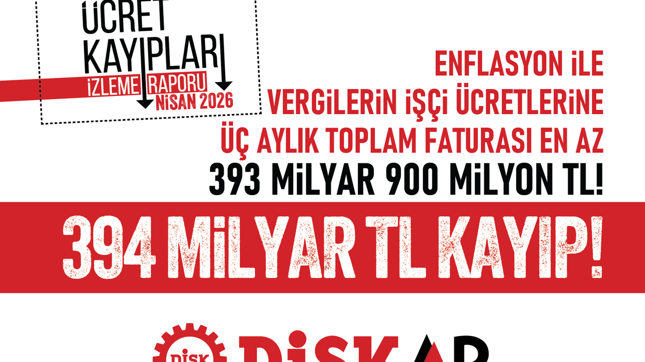 DİSK-AR, Nisan 2026 Ücret Kayıpları İzleme Raporu'nu yayımladı. DİSK-AR'ın sosyal medya hesabından yayımlanan rapora ilişkin açıklamada, 'Yüksek enflasyon ile adaletsiz vergi ve kesintiler işçi ücretlerini eritmeye devam ediyor' denildi. Raporda, 2026'nın ilk üç ayında işçi ücretlerinde en az 393 milyar 900 milyon liralık toplam kayıp oluştuğu belirtilirken, bu kaybın önemli bölümünün enflasyon ve vergi kaynaklı olduğu ifade edildi.