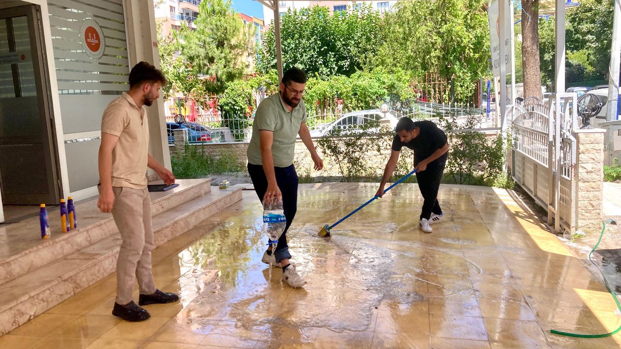 Çöp yığınları konuk evinin önünden kalrdıran personel, civardaki marketten bol miktarda porçöz ve benzeri temizlik detarjanlarını alarak buldukları su ile köpürterek temizlediler.