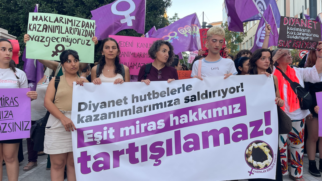 Diyanet İşleri Başkanlığı'nın son cuma hutbesinde kadınların miras hakkına ilişkin ifadelerine karşı kadınlar sokağa döküldü. Kadınlar Birlikte Güçlü Platformu’nun çağrısıyla Kadıköy Süreyya Operası önünde toplanan kadınlar, eşit miras hakkının tartışılamayacağını vurguladı.