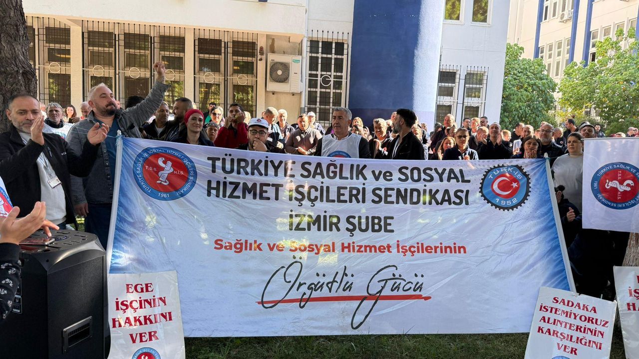 Ege Üniversitesi çalışanları bağ bulundukları Türkiye Sağlık ve Sosyal Hizmet İşçileri Sendikası İzmir Şubesi öncülüğünde hastane bahçesin eylemlerini sürdürürken hastaneye tedavi için gelen hasta yakınları tarafından da alkışlarla desteklendi.