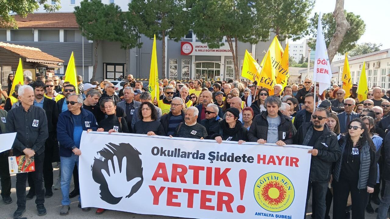 İş bırakma eylemi kapsamında Antalya'da Eğitim-Sen üyeleri, İl Milli Eğitim Müdürlüğü önünde bir araya geldi. Basın açıklamasını okuyan Eğitim-Sen Antalya Şube Başkanı Kadir Öztürk, okullarda güvenlik mekanizmalarının yetersizliğine dikkat çekti.