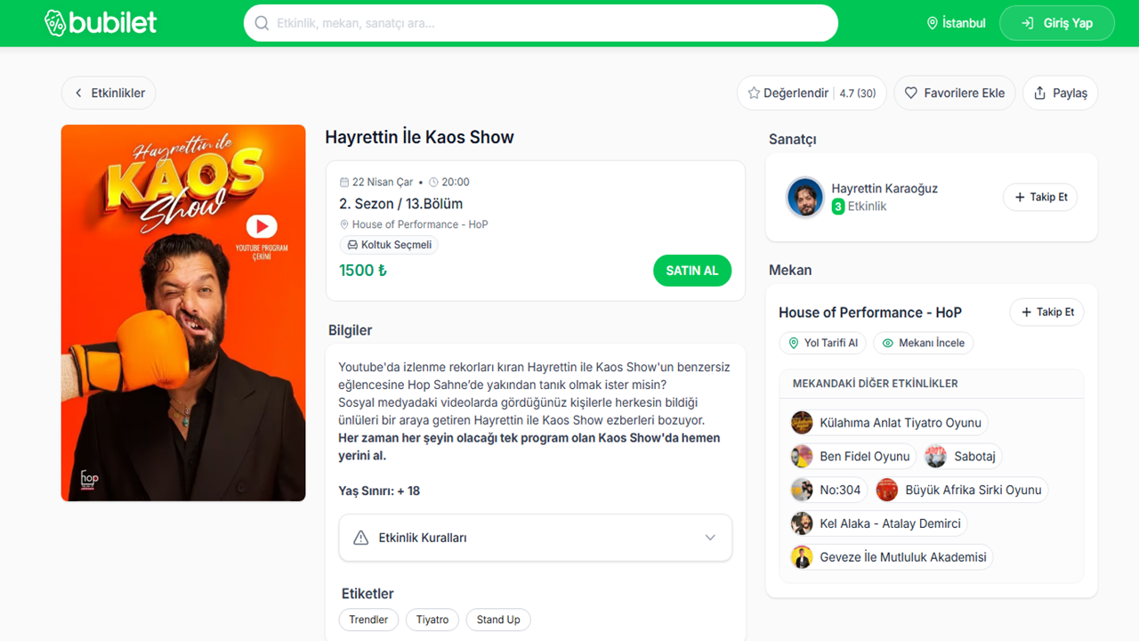 Bubilet, sunduğu geniş yelpaze ve kullanıcı odaklı yaklaşımıyla, eğlence ve kültür dünyasına açılan kapınız haline geliyor. Hayrettin Kaos Show'un sınırsız kahkahalarından Güldür Güldür Samsun yerel dokunuşlarına, Unutulmaz anlar biriktirmek, sevdiklerinizle yeni deneyimler paylaşmak ve günlük hayatın monotonluğunu kırmak için Bubilet'in zengin dünyasını keşfedin. Eğlenceye giden en kısa yol, Bubilet'ten geçiyor. Bubilet ile hayatınıza renk katın, kültürel etkinliklerin ve sahne sanatlarının büyülü dünyasına adım atın.
