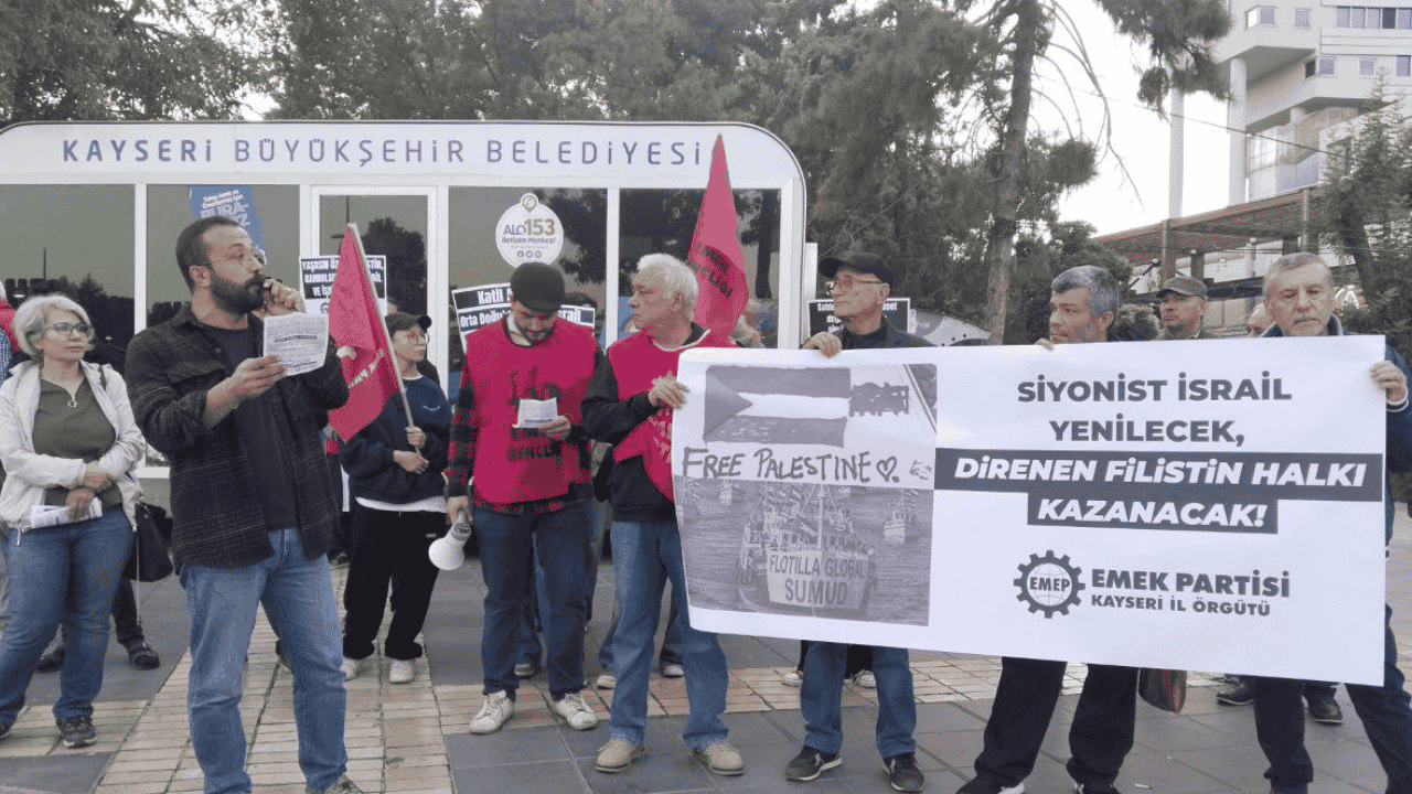 Emek Partisi (EMEP) Kayseri İl Örgütü, Gazze’ye insani yardım taşıyan Küresel Sumud Filosu’na İsrail tarafından yapılan müdahale girişimini protesto etmek amacıyla Cumhuriyet Meydanı’nda bir eylem düzenledi. Açıklamada, bu müdahalenin sadece bir askeri tehdit değil, aynı zamanda küresel dayanışmaya karşı verilmiş bir gözdağı olduğu vurgulandı.