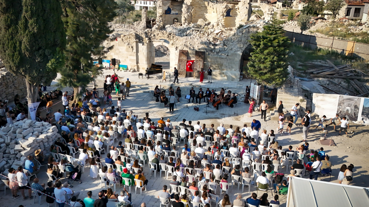 Kahramanmaraş merkezli 6 Şubat 2023'teki depremlerde yıkılan Antakya Ortodoks Kilisesi'nin avlusunda World Monuments Fund İzleme Günü etkinliği düzenlendi.
