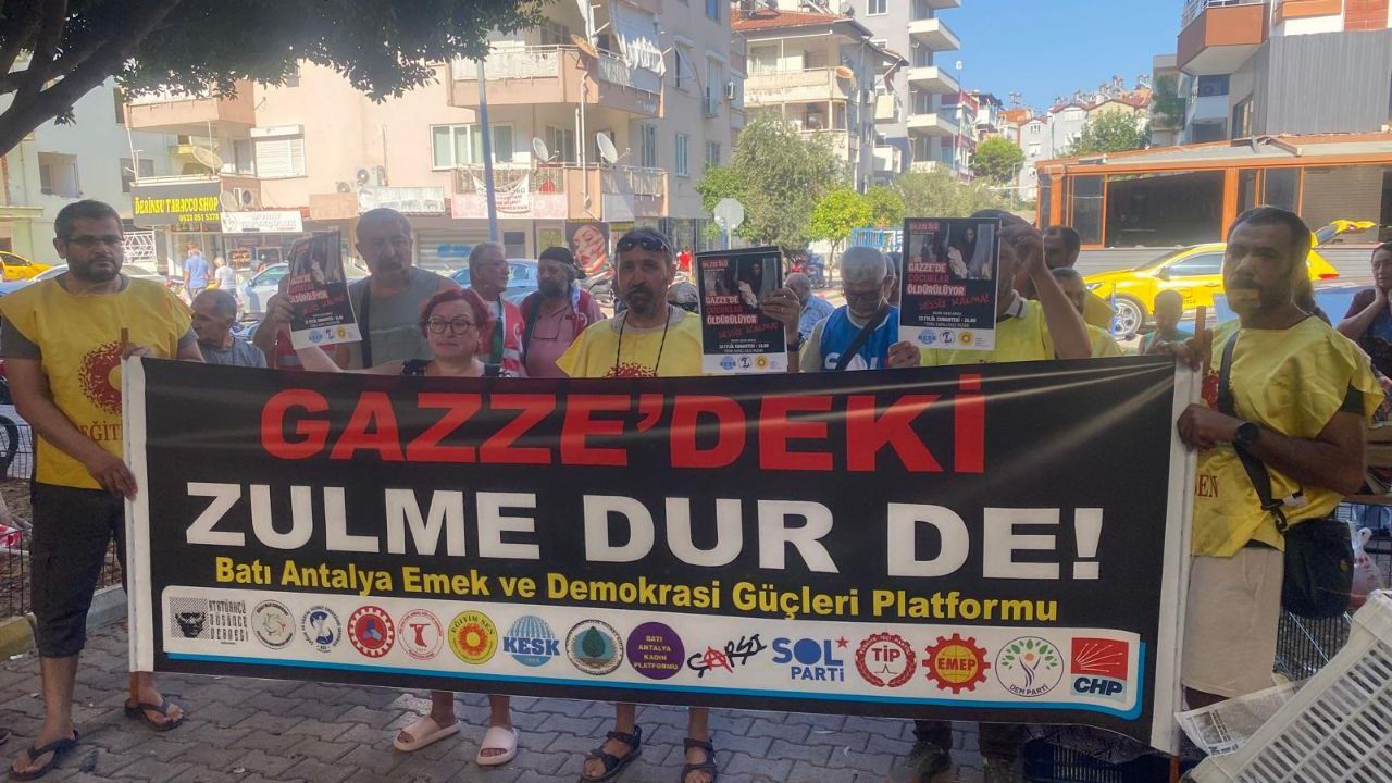 Batı Akdeniz Emek ve Demokrasi Güçleri, Gazze’de aylardır devam eden saldırılara karşı Finike kapalı pazarında bir araya geldi. Yapılan basın açıklamasında, saldırıların insanlık tarihine kara bir leke olarak geçtiği belirtilirken, en ağır bedeli çocukların ödediği ifade edildi.