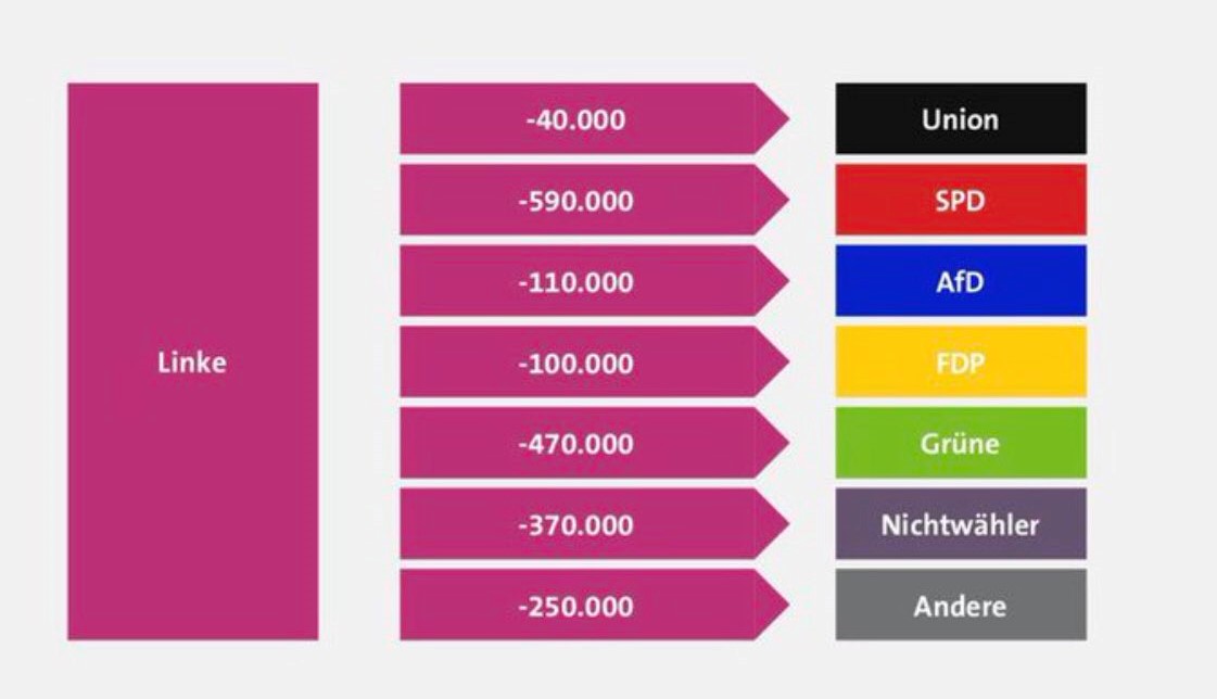 Sol Parti'deki oy kayıplarının detayına bakıldığında hemen her partiye oy kaçışı olduğu görülüyor. SPD'ye 600 bin, Yeşiller'e 500 bin düzeyinde oy kaybettiği düşünülen Sol Parti seçmenlerinin 370 bininin de oy kullanmadığı düşünülüyor. 250 bin Sol Parti seçmeninin ise "Diğerleri" başlığı altında yer alan sol ve komünist partilere de yöneldiği belirtiliyor. 110 bin Sol Parti seçmeninin AfD'ye yönelmesi de bir başka ilginç veri.