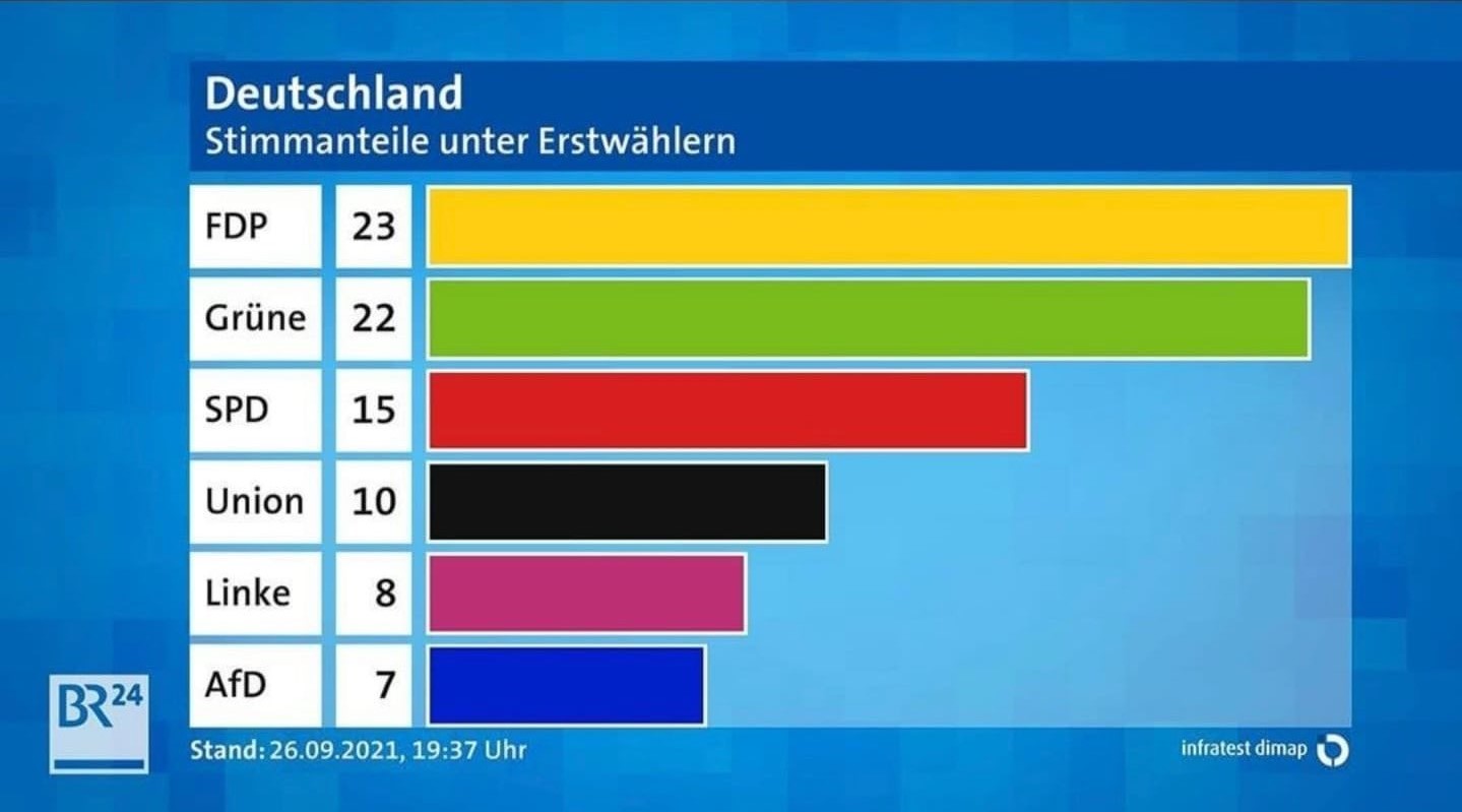 Almanya'da ilk kez oy veren seçmenlerin oy dağılımı ise bambaşka bir Almanya'ya işaret ediyor. Liberal FDP yüzde 23 ile ilk kez oy kullanan gençlerin ilk tercihi olurken, "iklim krizi" vurgusu ile seçime giden Yeşiller yüzde 22 ile ikinci tercihi oluşturdu. Sol Parti de gençlerin yöneldiği partilerden oldu, gençler arasında genel oyundan fazla oy alan Sol Parti ilk kez oy verenlerin yüzde 8'inin oyunu aldı. SPD yüzde 15, Hristiyan Demokrat Birlik ise yüzde 10 civarında kaldı. AfD'nin oyu da yüzde 7'de kaldı.