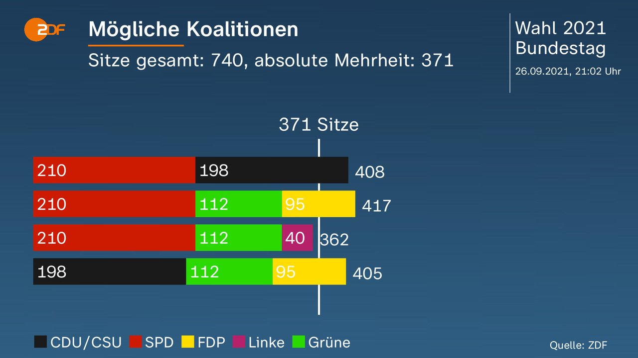 Almanya seçimleri matematiksel olarak üç koalisyon ihtimalini gündeme getirdi; en güçlü seçenek SPD-Yeşiller ve Liberallerden oluşan bir hükümet. İkinci seçenek ise SPD ve Hristiyan Birlik'ten oluşan geniş koalisyon. Halen Almanya'yı bu koalisyon yönetiyor. CDU/CSU'nun seçim sonuçlarını duyar duymaz dillendirdiği seçenek ise birinci parti SPD'yi dışarda bırakıyor. CDU/CSU ile Yeşiller ve Liberallerin vekil sayıları da hükümet kurmaya yetiyor, ancak bu seçeneğe zayıf gözüyle bakılıyor.