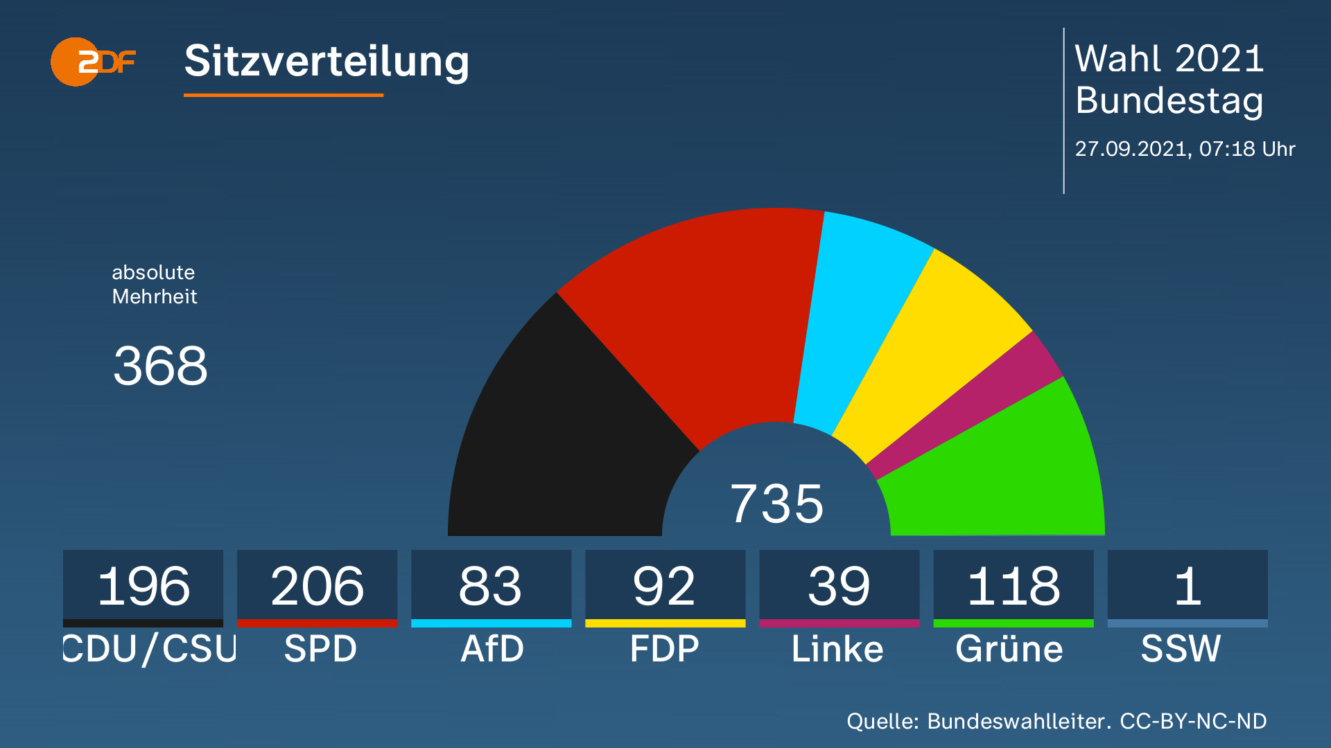 Almanya seçimlerinin bu sabah açıklanan geçici sonuçlarına göre; SPD sandalye sayısını 206'ya yükseltti. Hristiyan Birlik partileri 196'ya düşerken, üçüncü parti Yeşiller sandalye sayısını 118'e yükseltti. Liberal FDP de 92 sandalye kazandı. Sol Parti 69 sandalyeden 39'a gerilerke, aşırı sağcı AfD 83 milletvekili kazandı. Danimarkalı azınlığın partisi olan Schleswig Seçmenler Birliği de 1 milletvekili kazandı.