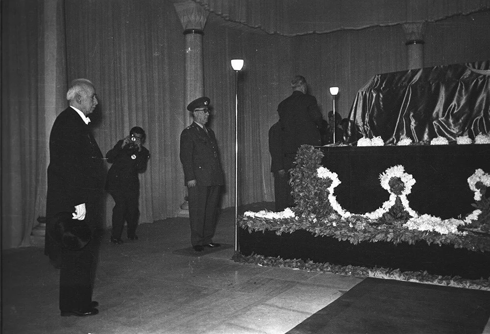 10 Kasım 1953 - Tabut mozoleye çıkan merdivenlerde hitabet kürsüsünde hazırlanan katafalka konuldu. Cumhurbaşkanı Bayar, konuşma yaparken.