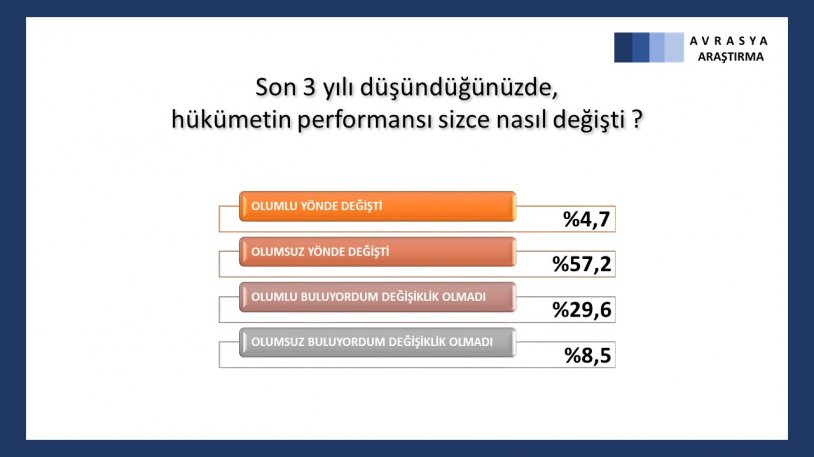 Araştırmada hükümeti başarısız bulanların oranı yüzde 63,4 olarak belirlendi. Başarılı bulanlar ise sadece yüzde 27,5 oldu.