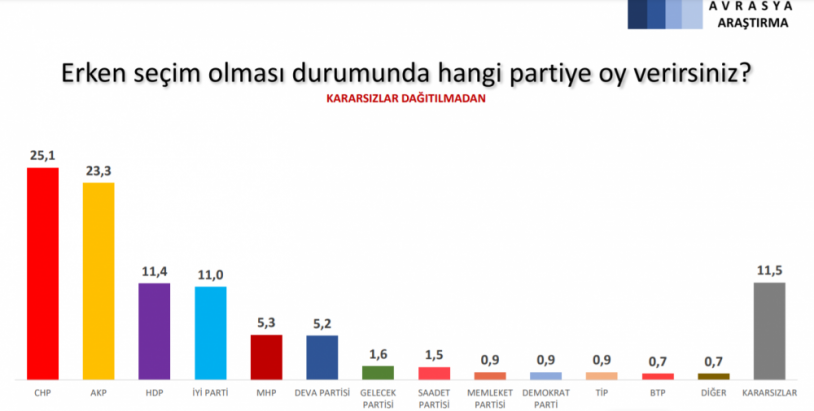 Araştırmaya göre, olası bir erken seçimde CHP birinci parti olarak yer buldu. Kararsızlar dağıtılmadan partilerin oy oranları şöyle: