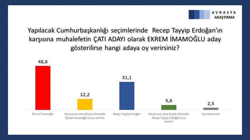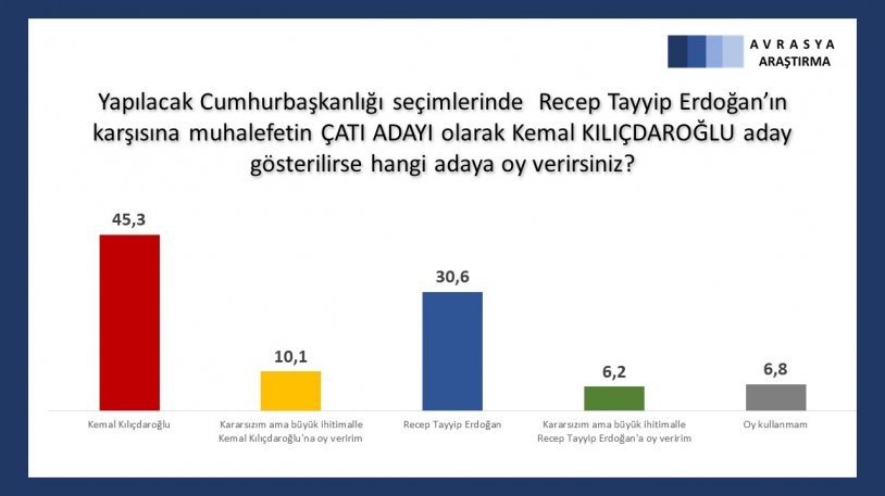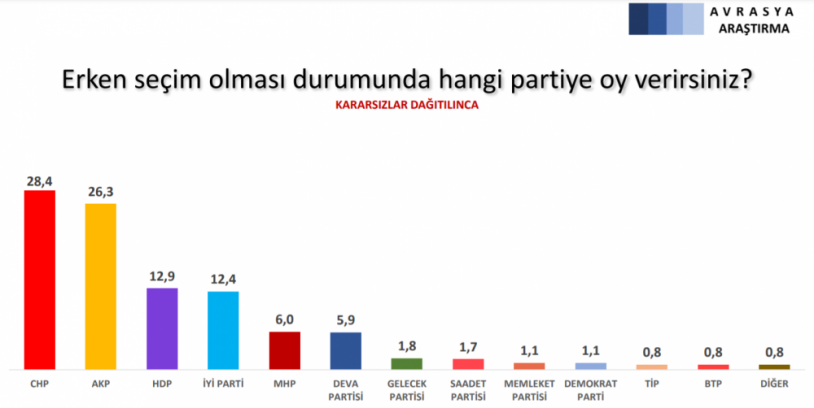 Kararsızlar dağıtıldığında ise CHP yüzde 28,4’e yükselirken, AKP’nin oy oranı ise yüzde 26,3 olarak belirlendi.