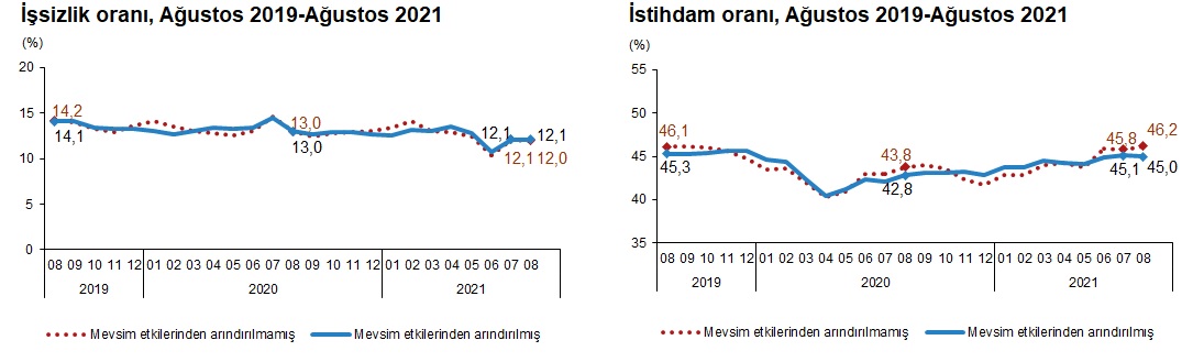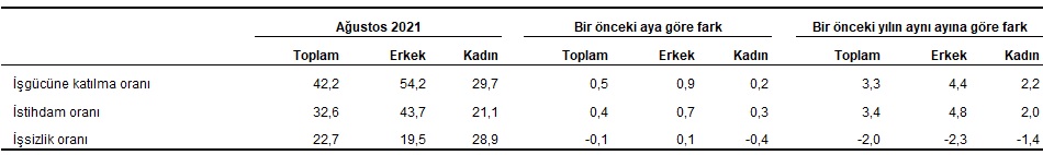 İstihdam edilenlerin sayısı Ağustos ayında bir önceki aya göre 14 bin kişi azalarak 28 milyon 706 bin kişi, istihdam oranı ise 0,1 puanlık azalış ile %45,0 oldu.