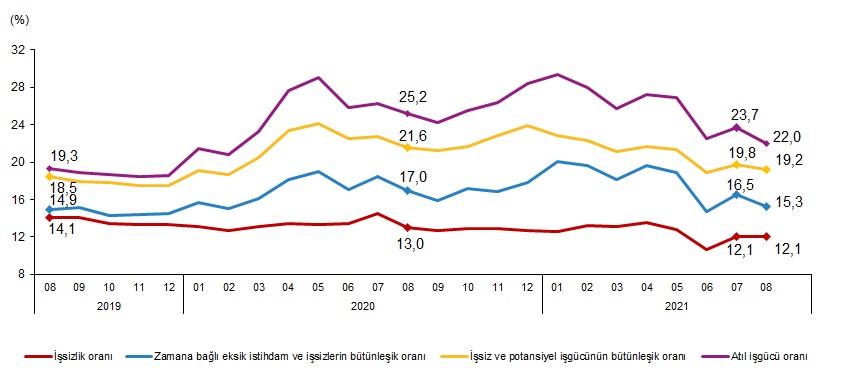 Mevsim etkisinden arındırılmış atıl işgücü oranı ise %22,0 olarak gerçekleşti. Zamana bağlı eksik istihdam, potansiyel işgücü ve işsizlerden oluşan atıl işgücü oranı bir önceki aya göre 1,7 puan azaldı.