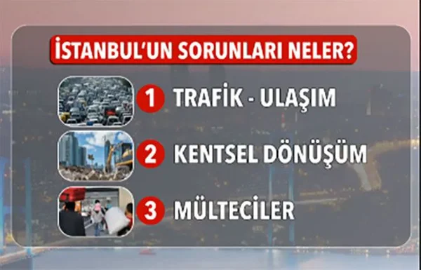 Ankete katılanlara İstanbul'un en büyük 3 sorunu soruldu. Katılımcılar İstanbul için en büyük sorunu trafik ve ulaşım olarak gösterdi. İstanbul'da ikinci büyük sorun olarak kentsel dönüşüm gösterilirken, İstanbul'un üçüncü büyük sorunu ise mülteciler olarak çıktı.