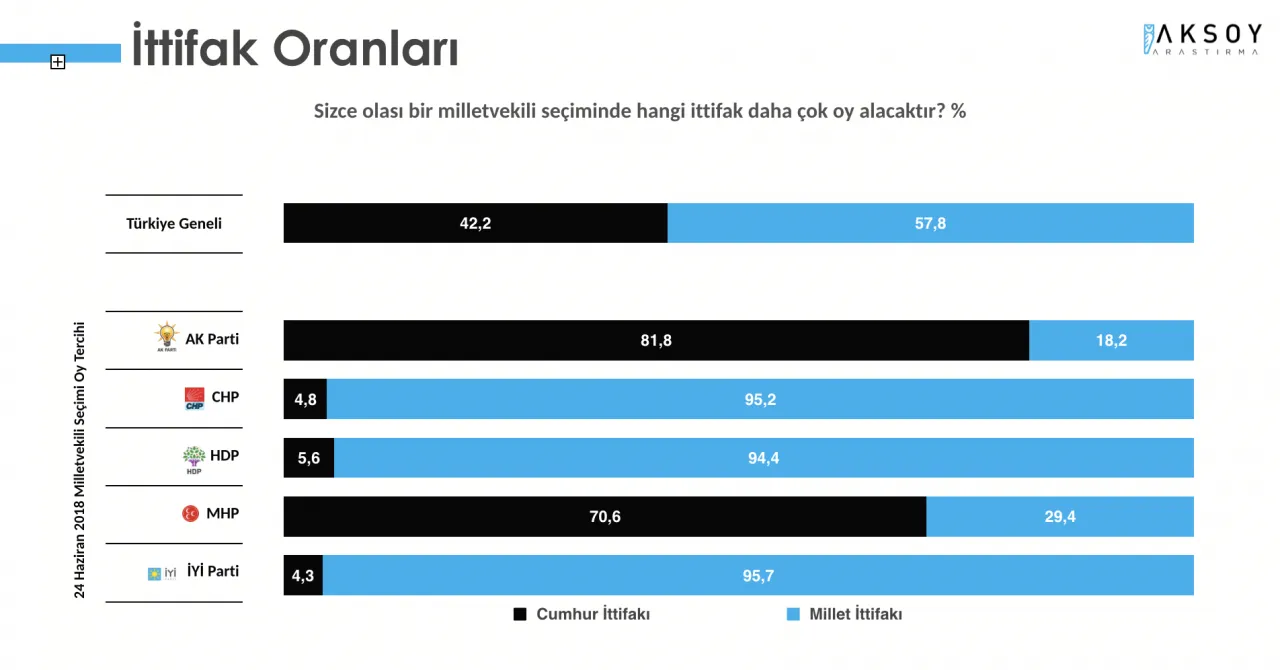 Kararsızlar dağıtıldığında tablo aynı kaldı. Kararsız seçmenin oyu dağıtıldığında AK Parti ve MHP 40,3, CHP ve İYİ Parti'nin oy oranı ise 41,6 oldu.