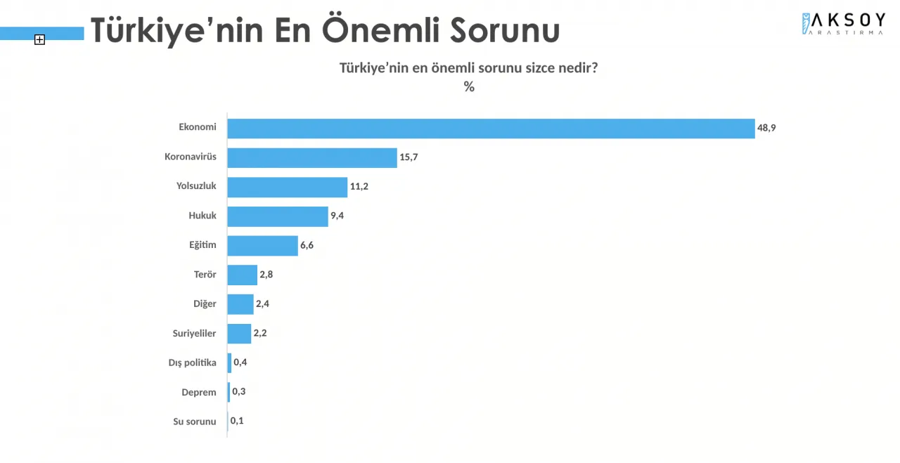 Ankete katılanlar, en önemli sorun olarak sırasıyla ekonomiyi, korona virüs salgınını yolsuzluğu, hukuk, eğitim ve terörü görüyor.