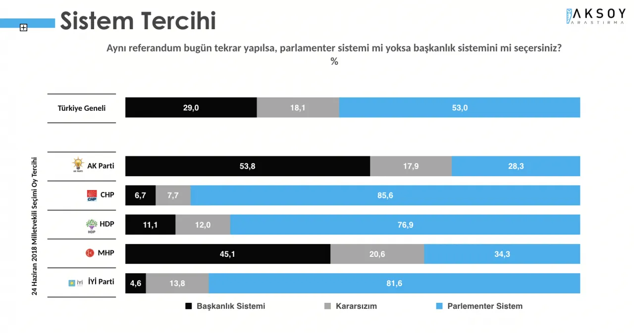 Araştırmaya göre ankete katılanların yüzde 53'ü parlamenter sisteme dönüşü savunuyor. 'Başkanlık sistemini seçerim' diyenlerin oranı yüzde 29,0.