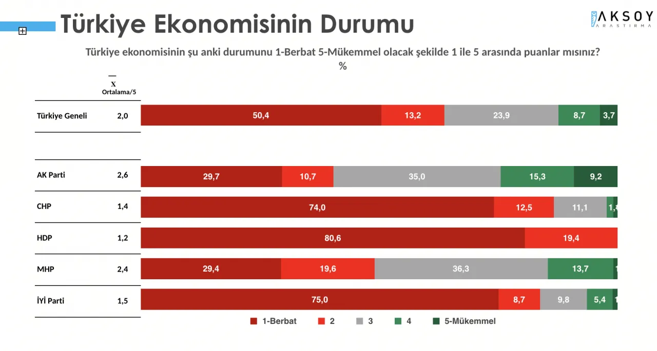 Ankete katılanlara Türkiye'nin mevcut ekonomik durumu da soruldu. Katılımcıların yüzde 54'ü ekonominin 'berbat' durumda olduğunu söyledi.