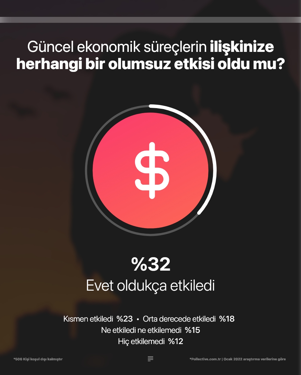 Hayatında biri olan kullanıcılara, güncel ekonomik süreçlerin ilişkilerini nasıl etkilediği sorulduğunda ortalama %37'nin hayatını son derece etkilerken toplamda %73'ün hayatına farklı derecelerde etki ettiği görülüyor. Hayatlarını etkilemediğini söyleyenler ise yüzde %28 oluyor. Yaş grupları detayında baktığımızda en çok etkilenen kitle %32 ile 26-55 yaş aralığındaki kadınlar olurken en az etkilendiğini söyleyenler %14 ile 16-25 yaş aralığında erkekler oluyor.