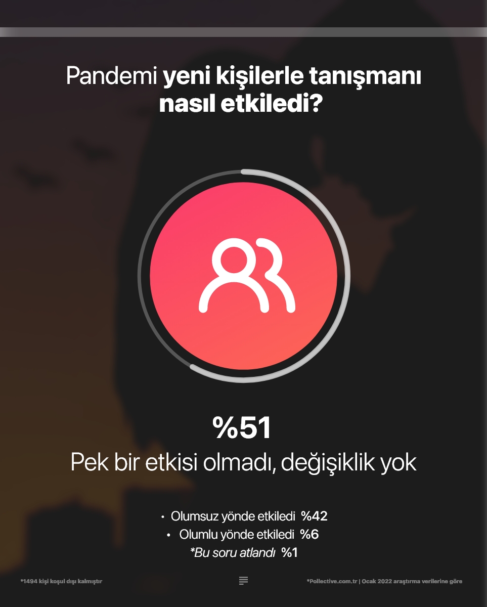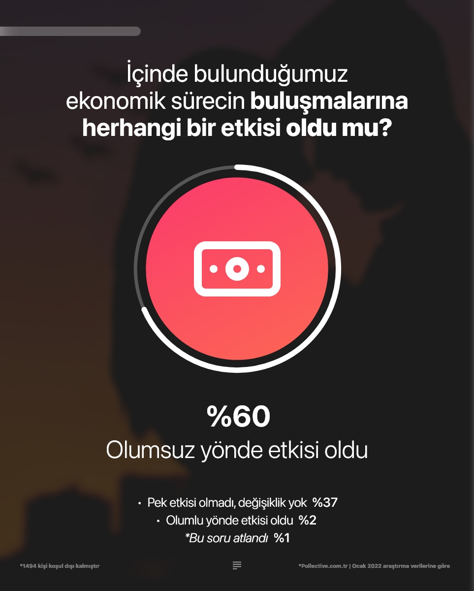 Hediye tercihlerinden, hediye alırken tercih edilen yöntemlere pek çok detayın yer aldığı araştırmada, kullanıcıların büyük bölümü güncel ekonomik süreçlerin ilişkilerini olumsuz etkilediğini düşünüyor. Pandeminin hayatlarını etkilemediğini söyleyenler sadece yüzde %28 düzeyinde. Kendini bekar olarak tanımlayan katılımcılara "pandeminin yeni kişilerle tanışmalarını nasıl etkilediği" sorulduğunda ise %46 oranında "olumsuz etkilediği" yanıtı alınıyor. Özellikle 25-55 yaş aralığındaki kadınlar bu süreçten en çok etkilenenler. Ortalama her iki kadından biri pandemi sürecinin yeni kişilerle tanışmayı olumsuz etkilediğini söylüyor. Pandeminin ardından gelen ekonomik kriz de yeni buluşmaları olumsuz etkiliyor. Hatta rakamlar ekonomik durumda yaşanan dalgalanmanın pandemiden daha fazla etki ettiğini ortaya koyuyor.