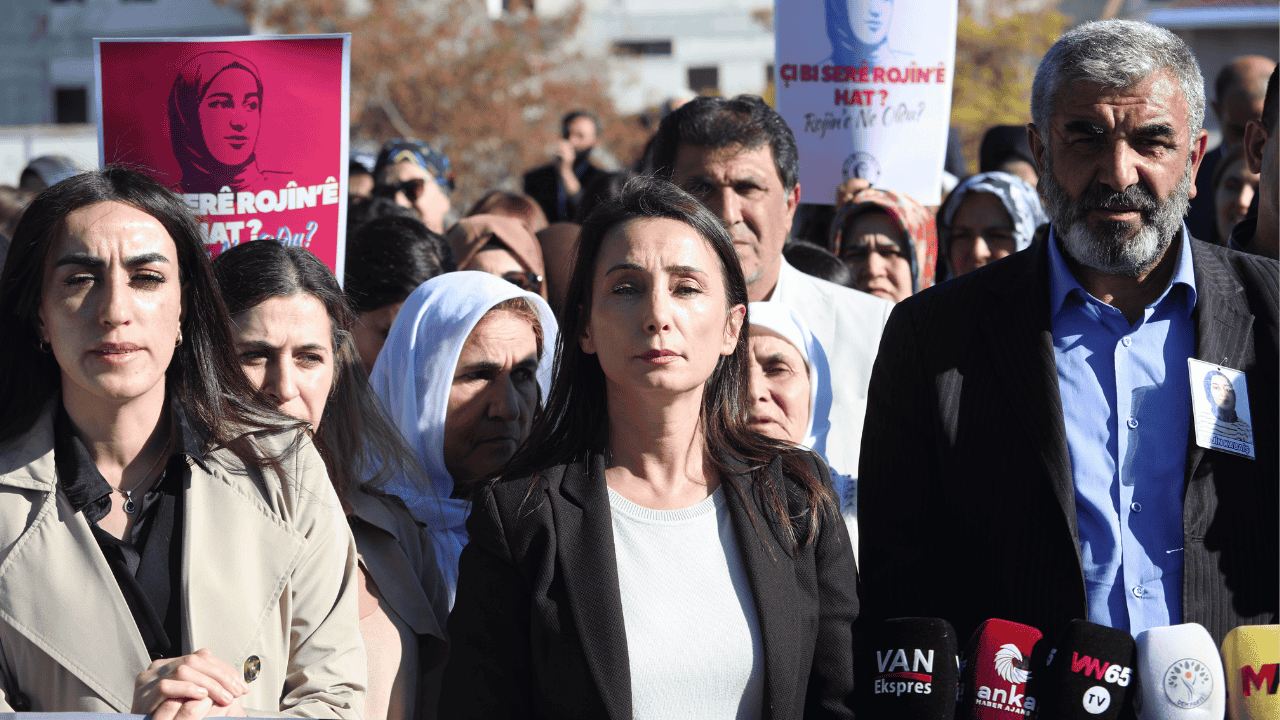 Van’da 27 Eylül 2024'te kaldığı yurttan ayrıldıktan sonra kaybolan ve cansız bedeni 15 Ekim 2024'te Mollakasım Mahallesi sahilinde bulunan Van Yüzüncü Yıl Üniversitesi Eğitim Fakültesi Çocuk Gelişimi Bölümü 1’inci sınıf öğrencisi Rojin Kabaiş'in şüpheli ölümünün aydınlatılması talebiyle DEM Parti Eş Genel Başkanı Tülay Hatimoğulları’nın katılımıyla Van Yüzüncü Yıl Üniversitesi’nde basın açıklaması düzenlendi.