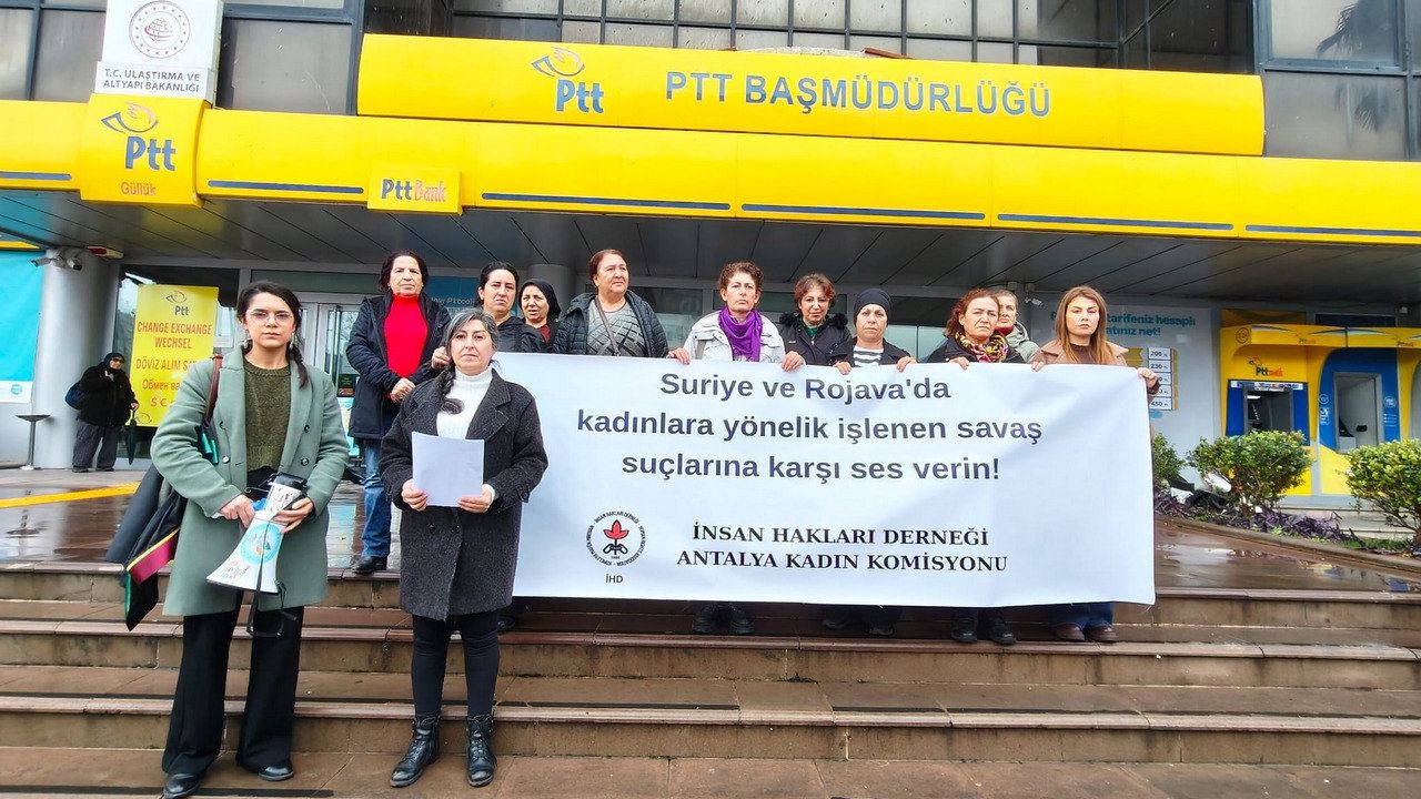 İHD Antalya Kadın Komisyonu, Suriye ve Rojava’da kadınlara yönelik sistematik saldırılara dikkat çekmek amacıyla Güllük Postanesi önünde basın açıklaması yaptı. Basın açıklamasını Semre Yeşilyurt okudu. Açıklamanın ardından Birleşmiş Milletler, Avrupa Birliği ve uluslararası insan hakları kurumlarına mektuplar gönderildi.