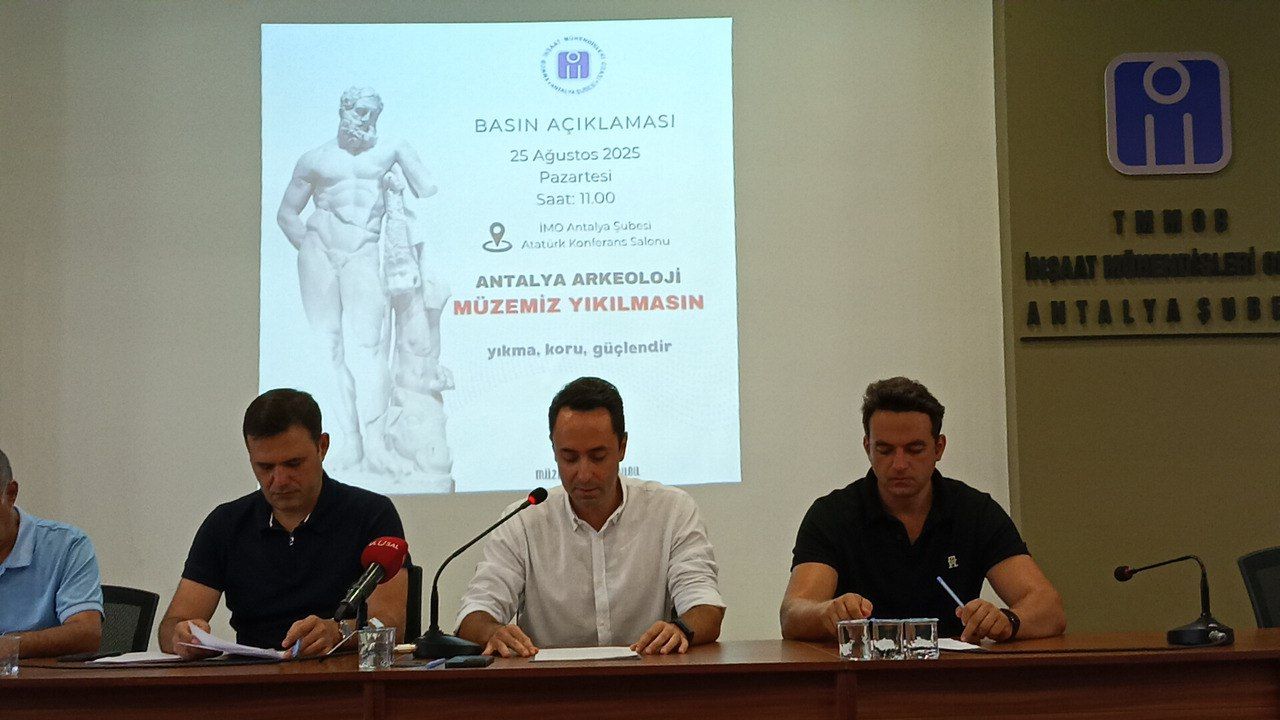 Antalya Arkeoloji Müzesi’nin yıkımı gündemdeki yerini korurken, İnşaat Mühendisleri Odası (İMO) Antalya Şubesi sürece dair itirazlarını bir kez daha dile getirdi. İMO Antalya Şube Başkanı Mehmet Soner Akdoğan ve 2. Başkan Erman Aydın, düzenledikleri basın toplantısında hem AKP Antalya Milletvekili İbrahim Ethem Taş’ın sözlerine hem de Kültür ve Turizm Bakanlığı’nın yürüttüğü yıkım sürecine tepki gösterdi.