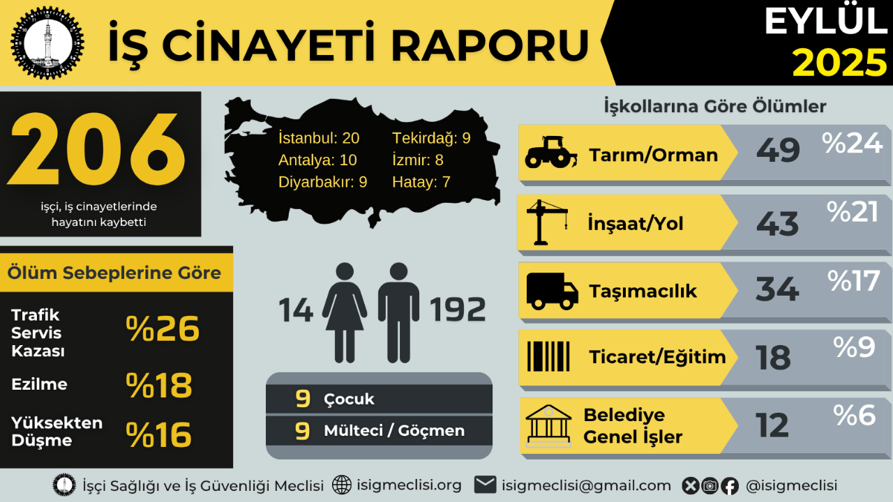 Raporda, Eylül ayında en az 9 göçmen işçinin hayatını kaybettiği belirtilirken, ölen göçmen işçilerden dördünün Suriyeli, ikisinin Mısırlı, birinin Moldovalı, birinin Türkmenistanlı ve birinin Ukraynalı olduğu ifade edildi. Göçmen işçilerin üçünün inşaat, ikisinin metal, ikisinin genel işler, birinin tekstil ve birinin gemi sektöründe çalıştığı kaydedildi.