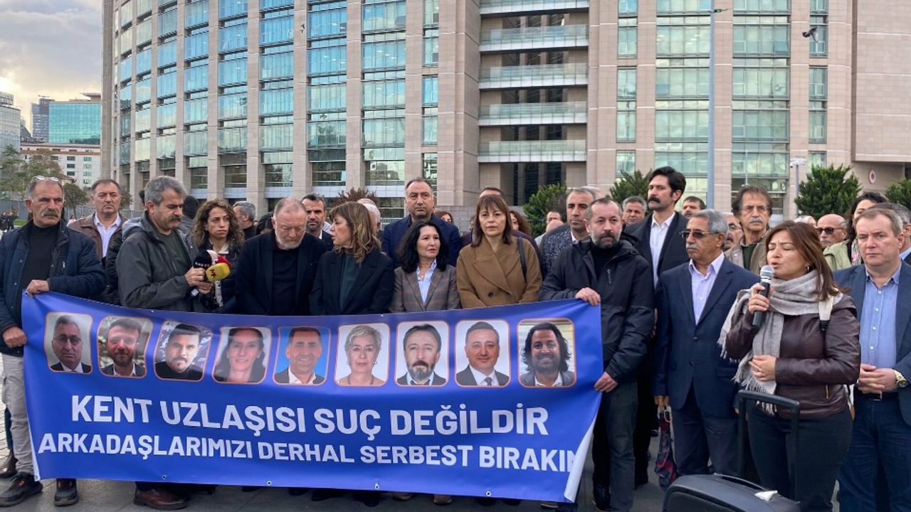 DEM Parti ve Halkların Demokratik Kongresi (HDK), "Kent Uzlaşısı" davası öncesi Kent Uzlaşısı’na özgürlük talebiyle Çağlayan'da İstanbul Adliyesi önünde açıklama yaptı. Basın açıklamasına DEM Parti Erzurum Milletvekili ve Halkların Demokratik Kongresi (HDK) Eş Sözcüsü Meral Danış Beştaş, DEM Parti İstanbul Milletvekili Kezban Konukçu, DEM Parti Grup Başkanvekili Sezai Temelli, DEM Parti İstanbul Milletvekili Celal Fırat, HDK Eş Sözcüsü Ali Kenanoğlu ve İBB Meclisi CHP Grup Başkanvekili Ülkü İnanlı katıldı.