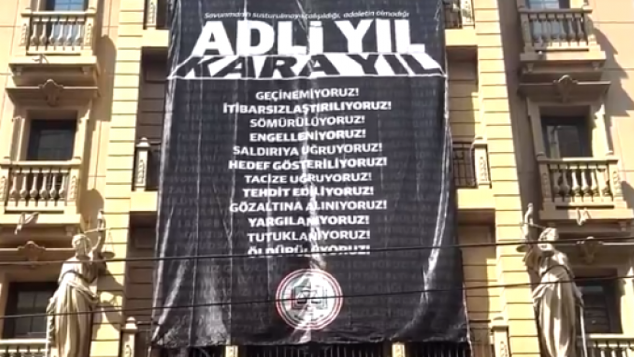 İstanbul Barosu, 2025-2026 Adli Yılı'nın ilk gününde "adaletin içinde bulunduğu durumu" Beyoğlu'nun İstiklal Caddesi'nde bulunan baro binasına "Kara Yıl" pankartı asarak anlattı. İstanbul Baro Başkanı İbrahim Özden Kaboğlu ve yönetim kurulu üyeleri tarafından asılan pankartta, "Kara Yıl, geçinemiyoruz, itibarsızlaştırılıyoruz, sömürülüyoruz, engelleniyoruz, saldırıya uğruyoruz, hedef gösteriliyoruz, tacize uğruyoruz, tehdit ediliyoruz, gözaltına alınıyoruz, yargılanıyoruz, tutuklanıyoruz, öldürülüyoruz" ifadeleri yer aldı.