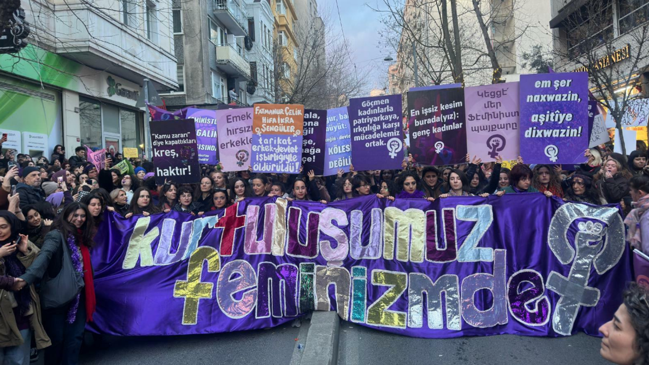 "Yüzyıllardır erkekler biz kadınların sırtından geçiniyor, kadınların karşılıksız emeği sayesinde karnı tok, sırtı pek bir hayat sürüyor. Kadınların ev içinde yeniden ürettiği yaşam sayesinde kamusal hayatta boy gösteriyor, ücretli işlerde rahatça çalışıp statü elde edebiliyor. Kadınların cinselliklerini kontrol ediyor, adına sevgi diyerek kadınların kendi hayatları üzerindeki karar alma haklarını gasp ediyor. Kadınların kendilerine tabi olduğuna dair sarsılmaz inançla, kadınlara şiddet uygulamayı, öldürmeyi kendilerine hak görüyor. Bazen arkalarına bir tarikatı, bazen bir çeteyi, bazen devletin savcısı olmanın gücünü alarak. Önleyici koruyucu politikaların uygulanmamasından, cezasızlıktan, kadınların en temel haklarının; medeni kanunun, boşanmanın, nafakanın, kürtajın sürekli tartışma konusu yapılmasından, saldırı altında olmasından besleniyor erkekler. Yok 'aile yılı', yok 'bizi cinsiyetsizleştirecekler' diyerek, işi cinsiyeti denetlemeye kadar vardırıp 'cinsiyetine uygun olmayan davranışlar' diye uyduruk kategoriler yaratarak transların hormona erişimini ve yaşam hakkını engellemeye, temelde erkeklerin kadınlar üzerindeki egemenliğini korumaya çalışıyorlar. Çünkü bu egemenliğin tehlikede olduğunu biliyorlar, çünkü feminizmin değiştirme gücünün yarattığı tehlikenin farkındalar. Çünkü bu düzen değişecek. Bugün burada olan/olamayan, kendi hayatında patriyarkaya karşı mücadele veren her kadın sayesinde. Bizler, yüz yıl önce bu sokakta yürüyen bir kadının belki ancak hayal edebileceği bir mücadeleyi gerçek kılarak erkeklerin kadınlara karşı işledikleri suçları nasıl açığa çıkardıysak, yeni bir dünyayı da böyle kuracağız, feminist dayanışmamız sayesinde. Kendi hayatlarımıza yön vermek, özgür olmak, bedenimize, emeğimize, cinselliğimize, kimliklerimize sahip çıkmak için. Geleceğimize sahip çıkmak için. Kurtuluşumuz feminizmde diyoruz. Kurtuluş birlikte, feminist dayanışma ile mümkün. Kendi yaşamlarımızdan, bizden önce gelen tüm kadınlardan öğrendiklerimizle dünyayı dönüştüreceğiz. Çünkü barış içinde, çünkü düşman olmadan, çünkü eşit ve adil bir hayat kurarak yaşamanın mümkün olduğunu feminizmden öğrendik. Bu nedenle tekrar ediyoruz; yaşasın feminist mücadelemiz.”