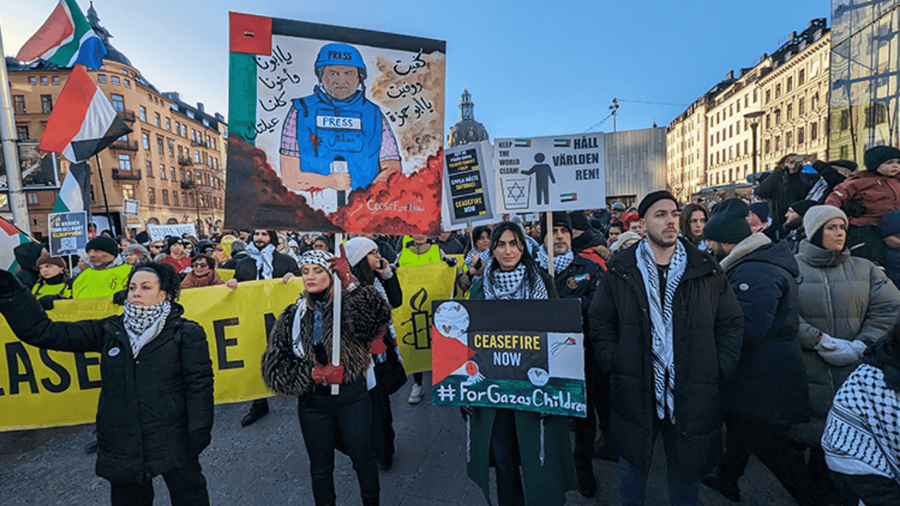 "Filistin işgali derhal sona ersin", "Soykırım ve abluka sona ersin", "İnsani yardıma serbest erişim ve Gazze'nin yeniden inşası", "İsrail barış anlaşmasına uysun" yazılı dövizler taşıyan göstericiler, İsveç hükümetini İsrail'e karşı kapsamlı askeri ambargo uygulamaya davet etti.