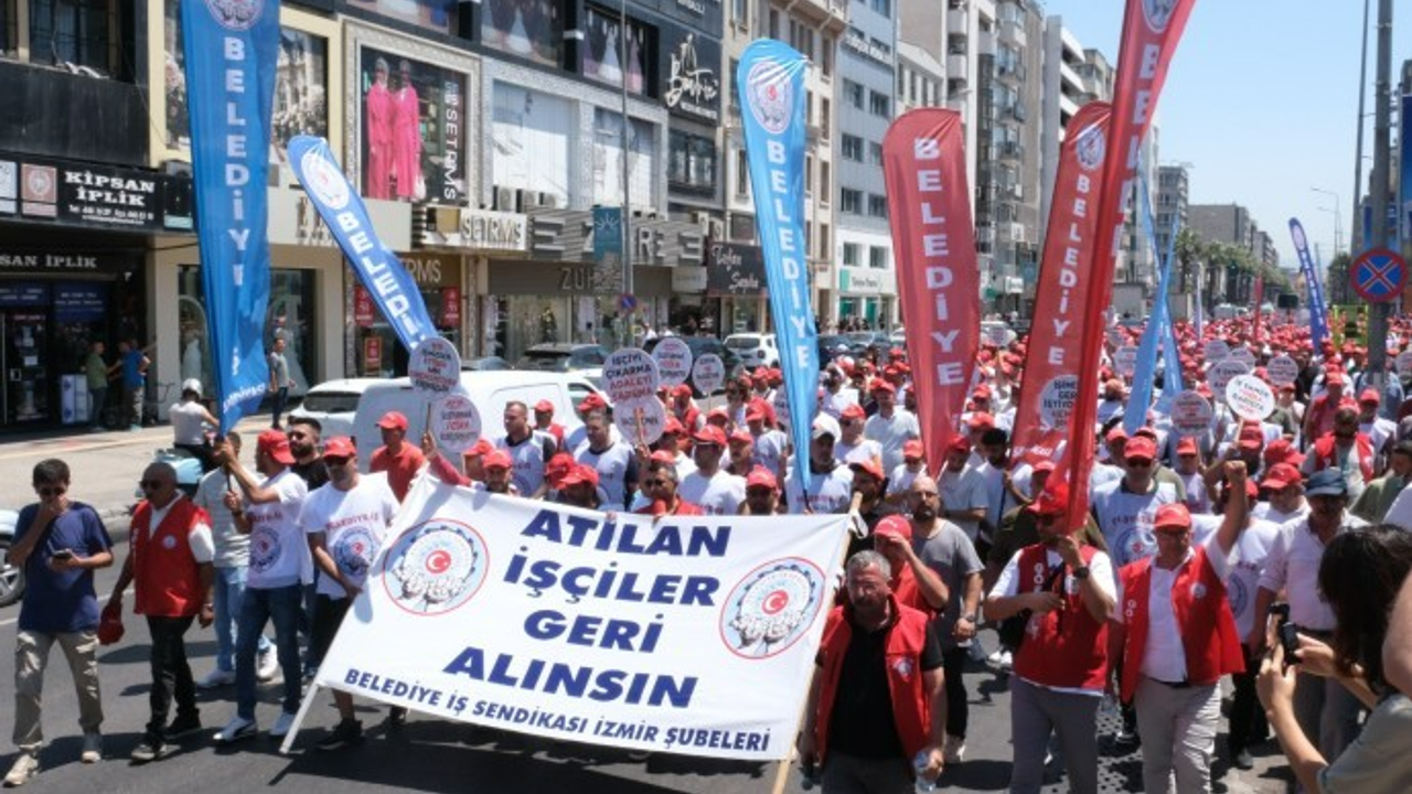 Türkiye Belediyeler ve Genel Hizmetler İşçileri Sendikası (Belediye-İş) İzmir Şubeleri, İzmir Büyükşehir Belediyesi'nde çalışan üyelerine yönelik alınan işten çıkarma kararına karşı sendika binasından belediyenin Egemenlik Evi binasına yürüdü.