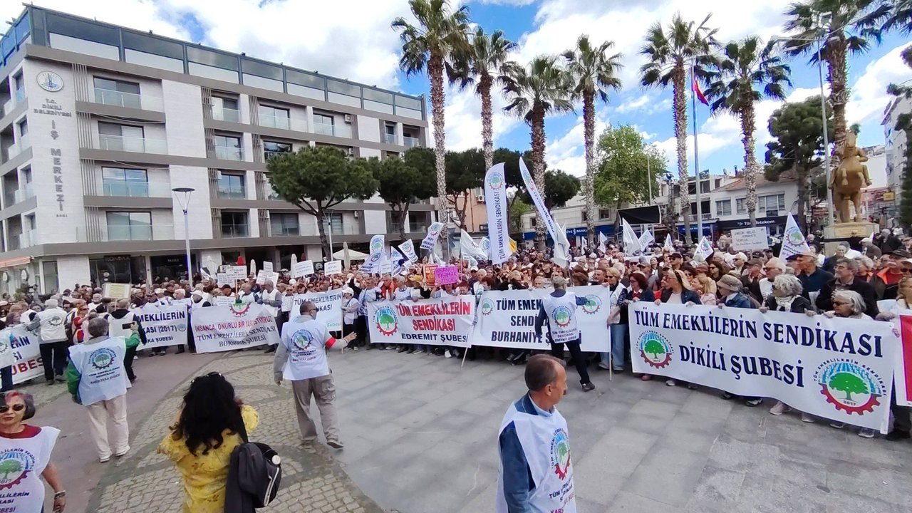 İzmir’in Dikili ilçesinde düzenlenen bölge mitinginde bir araya gelen emekliler; düşük emekli aylıkları, hayat pahalılığı ve sosyal hak kayıplarını protesto ederek intibak düzenlemesi talebinde bulunurken, sefalet zulmü olarak adlandırdıkları mevcut ekonomik şartlara tepki gösterdi.