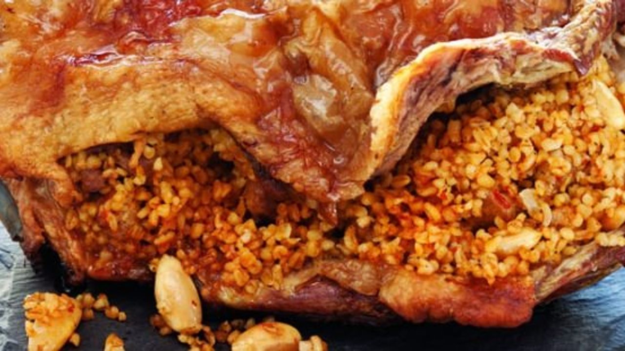 Malzemeler:2 kg dolmalık kuzu kaburgası2 su bardağı pilavlık bulgur250 gr kuşbaşı kuzu eti100 gr badem içi (kabukları soyulmuş)1 soğan2 yemek kaşığı biber salçası1 yemek kaşığı domates salçası2 yemek kaşığı tereyağı1 yemek kaşığı ayçiçek yağı2 su bardağı sıcak suTuzKarabiberNaneKırmızı toz biberHazırlanışı:Tereyağı ve kuzu etlerini tencerede soteleyin.Yemeklik doğradığınız soğan ve bademleri ilave edip sotelemeye devam edin.Salçaları ekleyip karıştırın.Yıkadığınız bulguru ilave edin.Tuz ve baharatları ekledikten sonra 2 su bardağı sıcak su ilave edin.Suyunu çekinceye kadar kısık ateşte pişirin.Kaburganın içini hazırladığınız pilav ile doldurun.Kaburganın ağzını ve açık olan her yeri fırın ipi ile dikin.Kaburgayı fırın tepsisine alın ve üzerini geçecek kadar sıcak su ilave edin.Tepsiye yağlı kağıt serip kaburgayı yerleştirin.Üzerini alüminyum folyo ile tamamen kapatın.Önceden ısıtılmış 180 derece fırında 2 saat pişirin.Fırından çıkarmaya yakın üzerini açıp hafifçe kızartın.Sıcak servis yapın.Afiyet olsun!