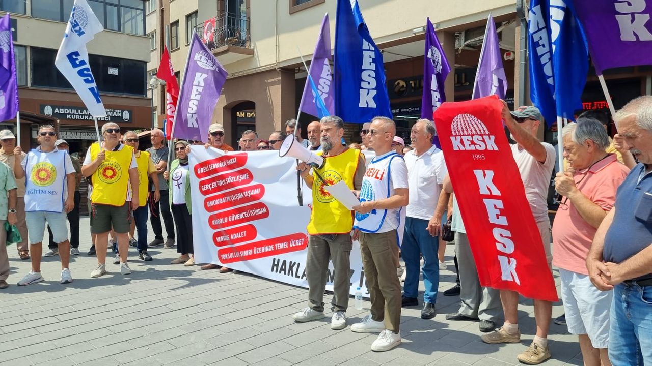 KESK Balıkesir Şubeler Platformu adına konuşan KESK Balıkesir Şubeler Platformu Dönem Sözcüsü Gürbüz Şahin, “Gerçek bir toplu sözleşme için üretimden gelen gücümüzü kullanıyoruz” diyerek kamu emekçilerinin taleplerini sıraladı.
